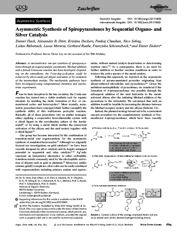 Asymmetric Synthesis of Spiropyrazolones by Sequential Organo- and Silver Catalysis