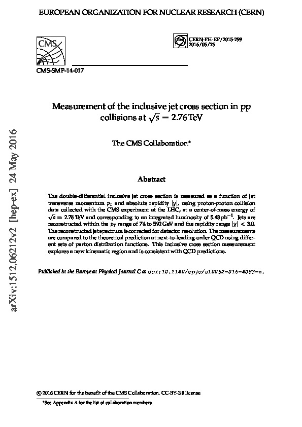 Measurement of the inclusive jet cross section in pp collisions at $\sqrt{s} = 2.76\,\text {TeV}$.